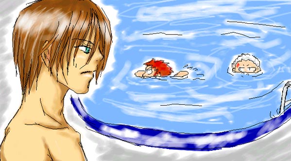 「お前らなぁ・・・プールから出ろって言ったろ? って聞いてねぇし。オラ、ヴィレンあがれ!身体ふやけるぞ! ゼンもいつまで泳いでやがる!!とっとと出ろ!!」 言う事聞かない児童の面倒は大変です☆ 絵チャ絵なんで線が歪んでる;;;